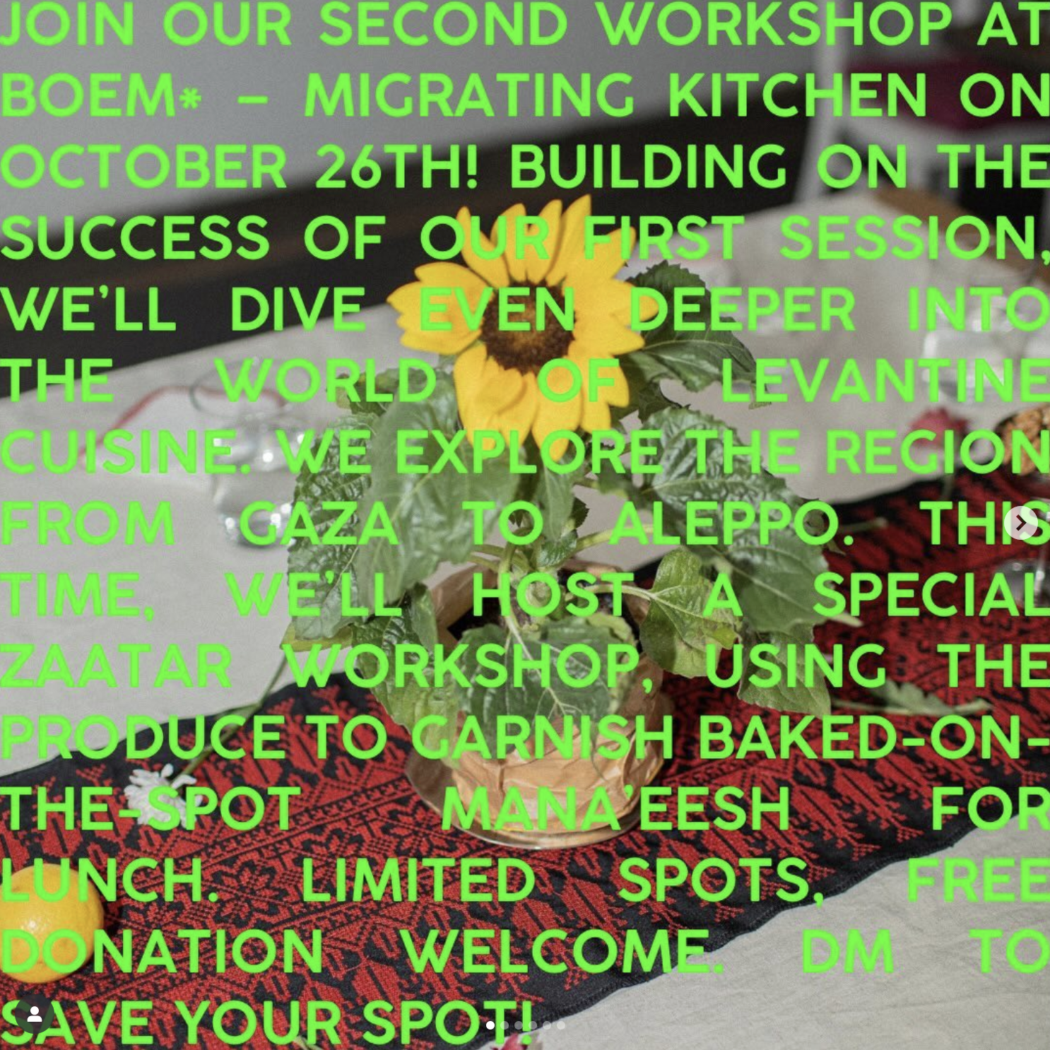 *NEW WORKSHOP ALERT* 🌿✨ join our second workshop at boem – migrating kitchen on october 26th from 10:00-14:00! building on the success of our first session, we’ll dive even deeper into the world of levantine cuisine. we explore the region from gaza to aleppo. this time, we’ll host a special zaatar workshop, using the produce to garnish baked-on-the-spot mana’eesh for lunch. limited spots, free donations welcome. dm to save your spot.